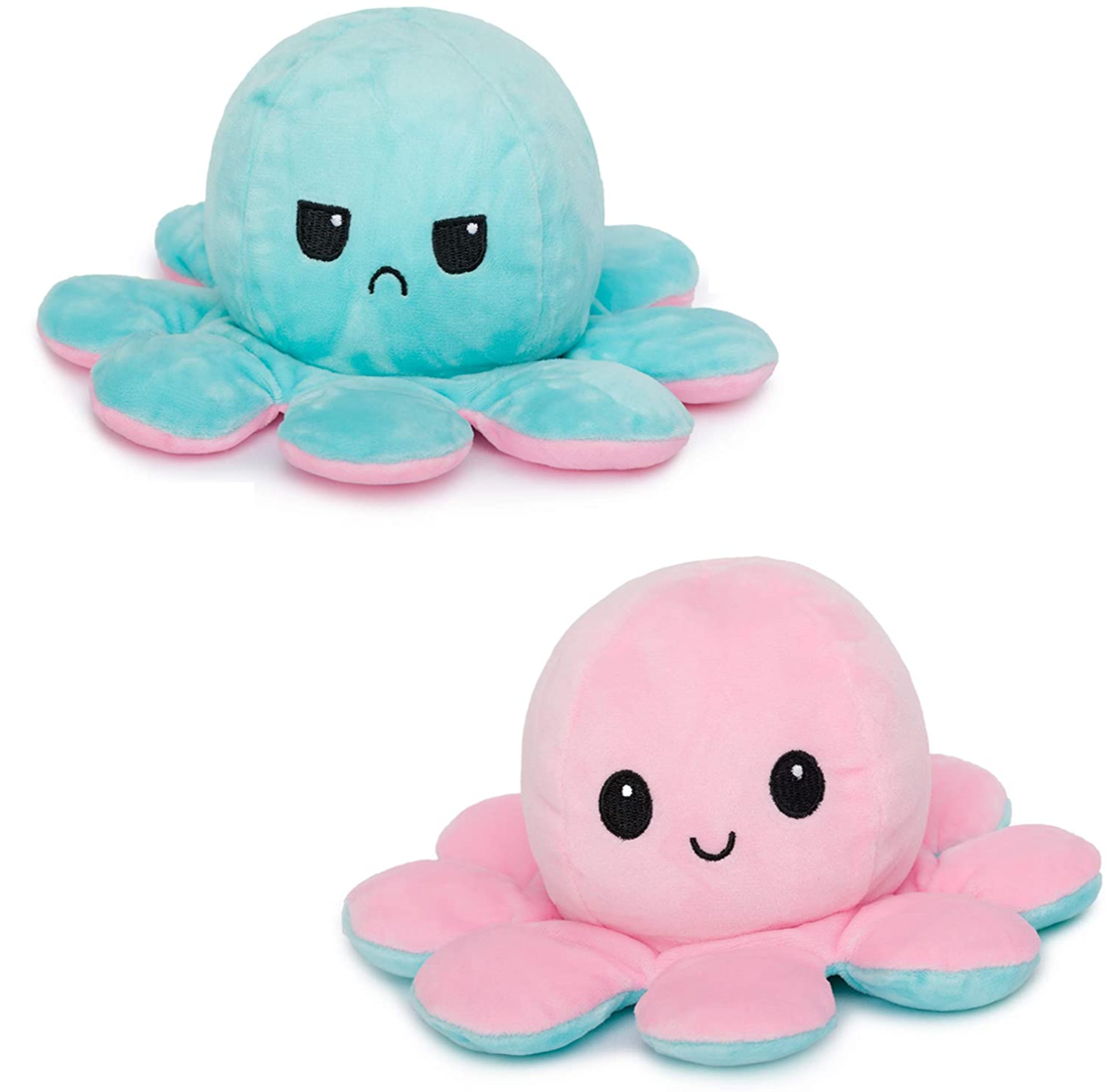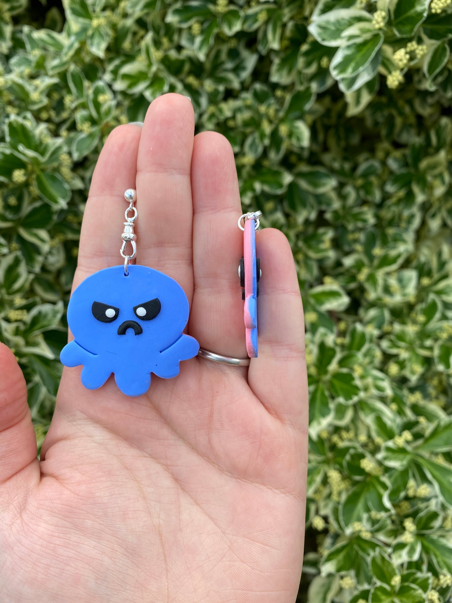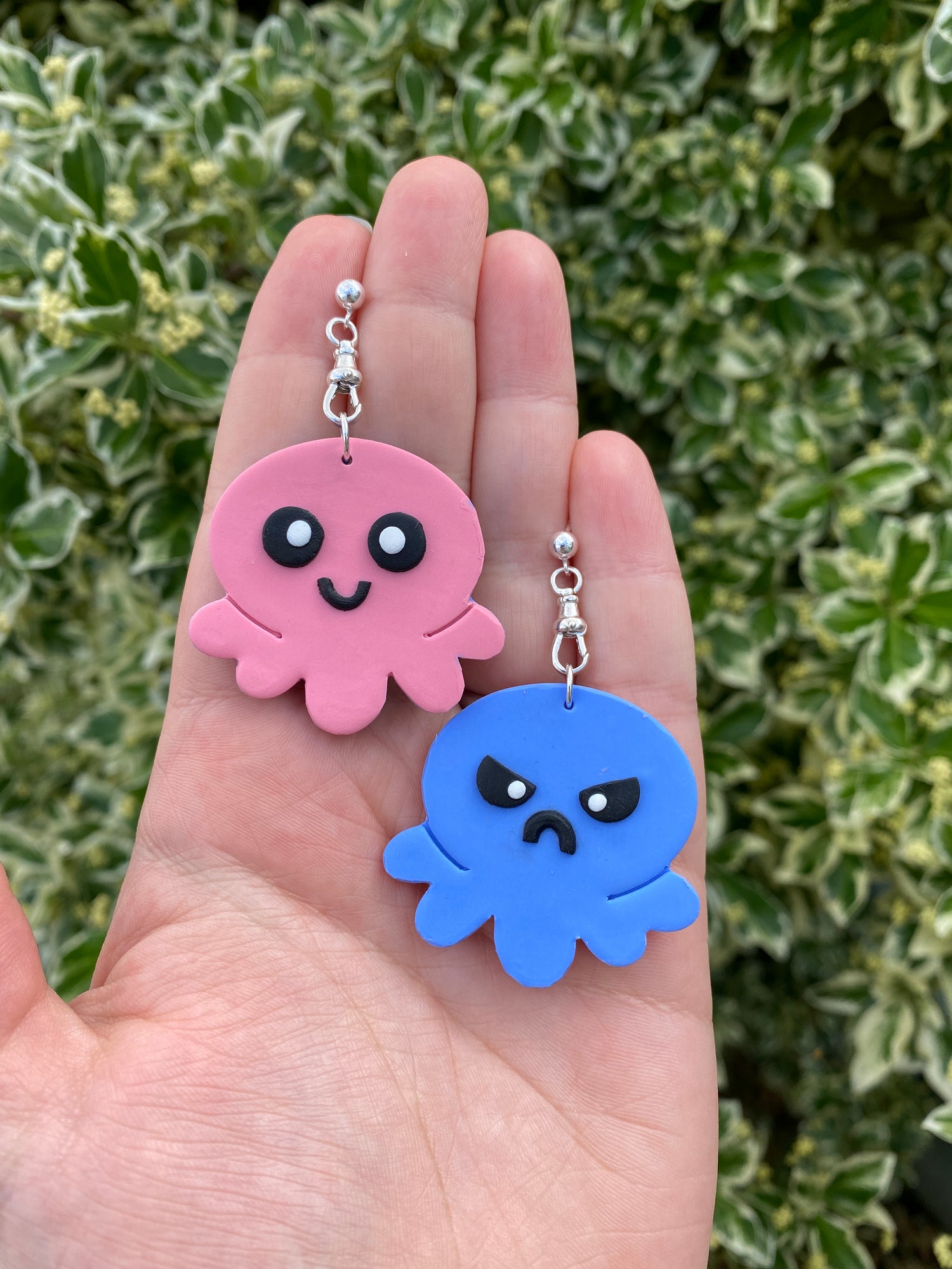 Earrings in the shape of an octopus plushie, pink with a happy face on one side, and blue with a grumpy face on the other