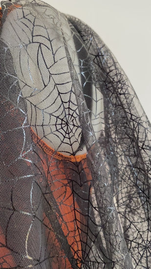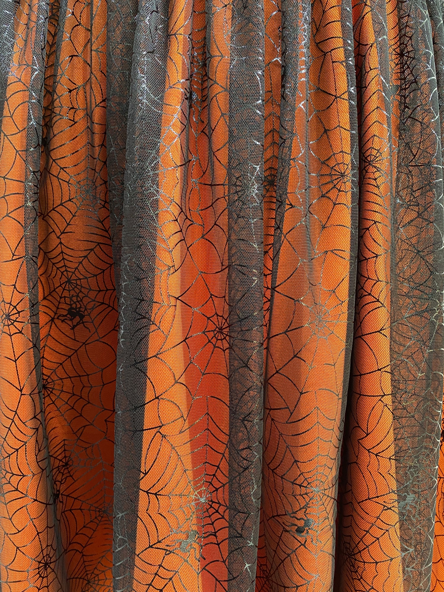 Orange cotton jersey dress with crossover top and circle skirt, with a black cobweb print tulle overskirt and puff sleeves